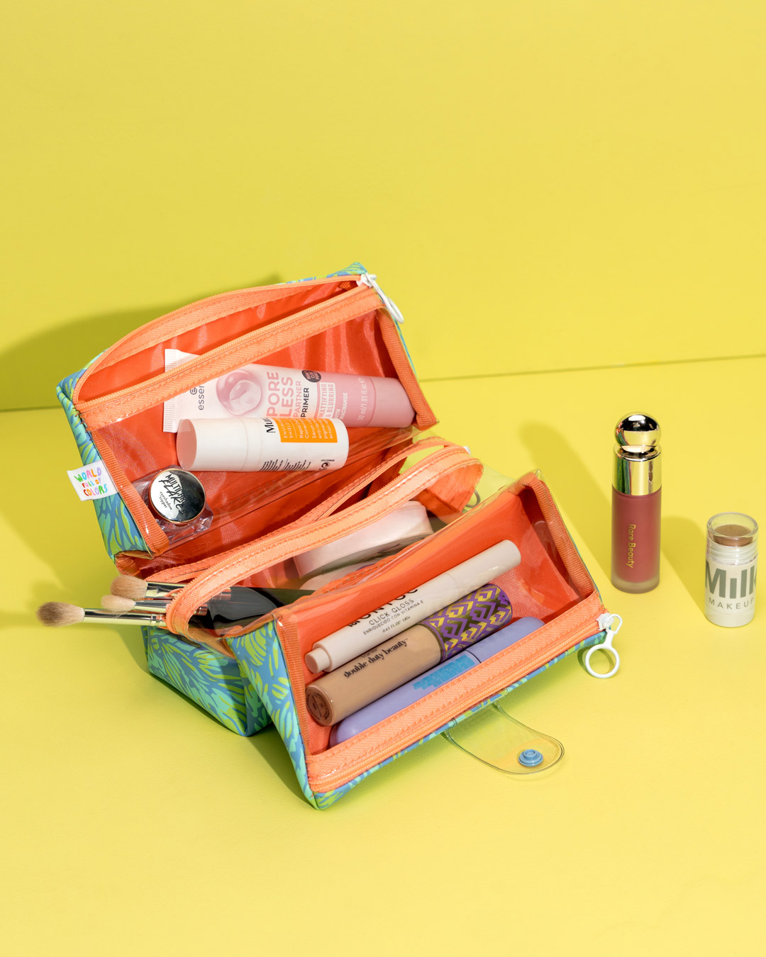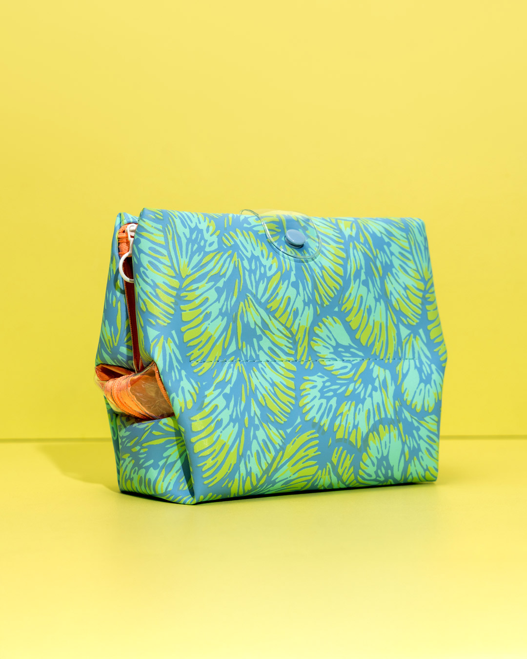 Cosmetiquera práctica para llevar maquillaje o productos de higiene facial. Tiene tres divisiones en vinilo translúcido para ver y clasificar fácilmente tus productos. Cada compartimento cuenta con cierre individual y se asegura con un broche externo. Ideal para mantener todo organizado y llevarlo en tu bolso o de viaje.