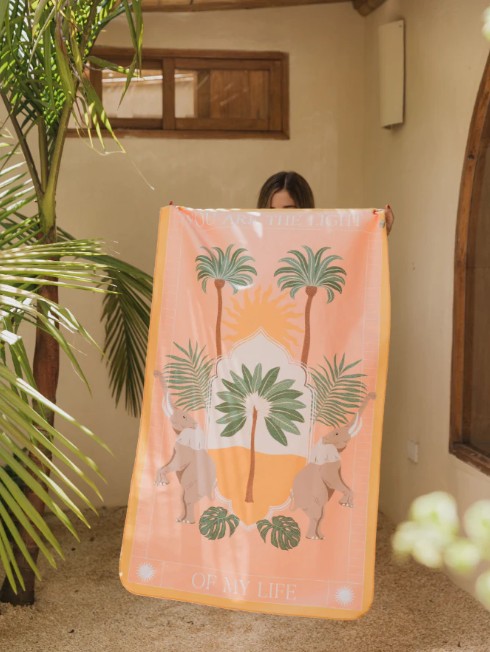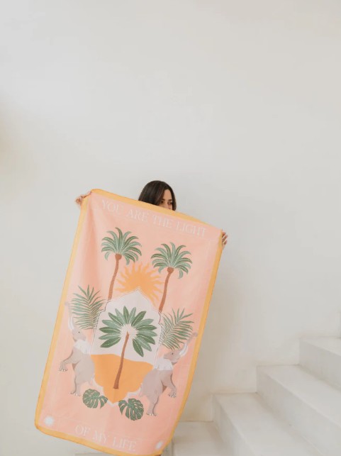Toalla estampada de microfibra, incluye elástico para colgarla y facilitar su secado, vienen en empaque de tela para que la lleves a todas partes!