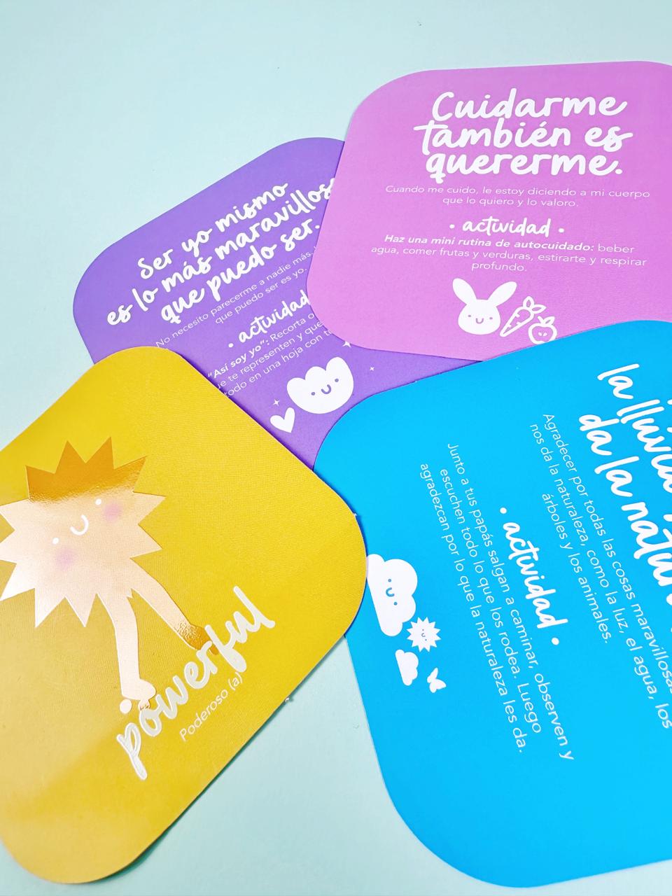 Pensadas para que niños y niñas fortalezcan su autoestima y bienestar emocional mientras se divierten. Cada afirmación está diseñada para acompañarlos en su camino de crecer, sentir y soñar, fomentando vínculos afectivos y emocionales que los conecten con los demás.